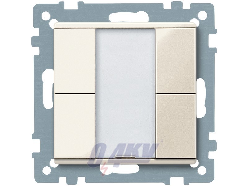 KNX Push-button, 2-gang plus. For System M. With integrated bus coupling unit. Push-button with 4 operating buttons, operating and status display and labelling field. The operating display can also be used as an orientation light. The device is connected to the bus line with a bus connecting terminal. KNX software functions: Switching, toggling, dimming (single/dual-surface), blind (single/dual-surface), pulse edges trigger 1-, 2-, 4- or 8-bit telegrams. Distinction between short and long operation, pulse edges with 2-byte telegrams (distinction between short and long operation), 8-bit linear regulator. Scene retrieval, scene saving, disable functions. Contents: With protective hood for plaster. With bus connecting terminal. Material: thermoplastic brilliant. Colour: white, glossy.