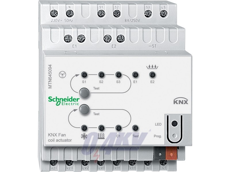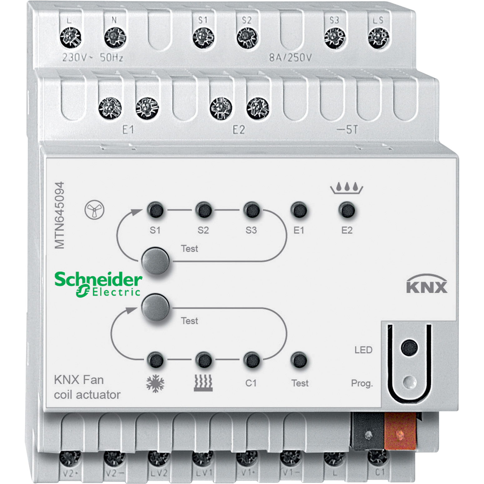 Fan Coil actuator can control one fan coil with up to three speed fan and 2 valves. It can control 2 or 4 pipe fan coils. the actuator can be installed for Installation on DIN rails TH35 according to EN 60715 It has Two floating binary inputs for example for window contact and level contact for condensed water container. Each fan relay has 8A switching capacaity. The push-button plus with room temperature control can be used to activate the fan coil actuator. There is an Auxilary relay with switching capacity 16 A for electrical heating as an example. Power supply is AC 230 V ±10 %, 50/60 Hz. The device has 4 module width, approximately 72 mm. The color of device is light grey.